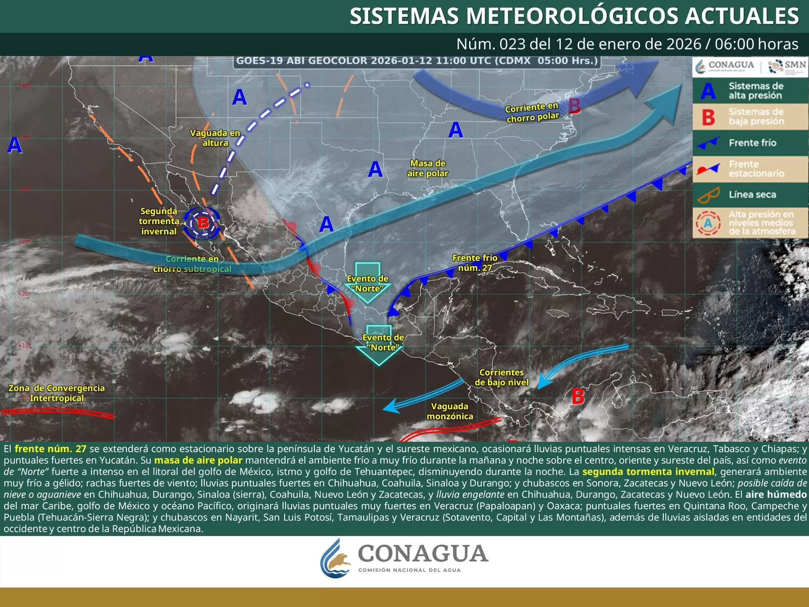 Lo anterior, ocasionado por la intensa masa de aire polar que impulsa al frente frío número 27, el cual cubre gran parte de la República Mexicana.