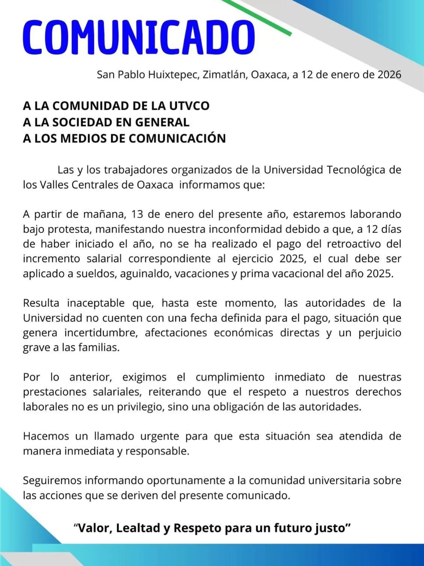 Trabajadoras y trabajadores de la Universidad Tecnológica de los Valles Centrales de Oaxaca (UTVCO) iniciaron labores bajo protesta, ante el incumplimiento en el pago del retroactivo del incremento salarial correspondiente al ejercicio fiscal 2025.