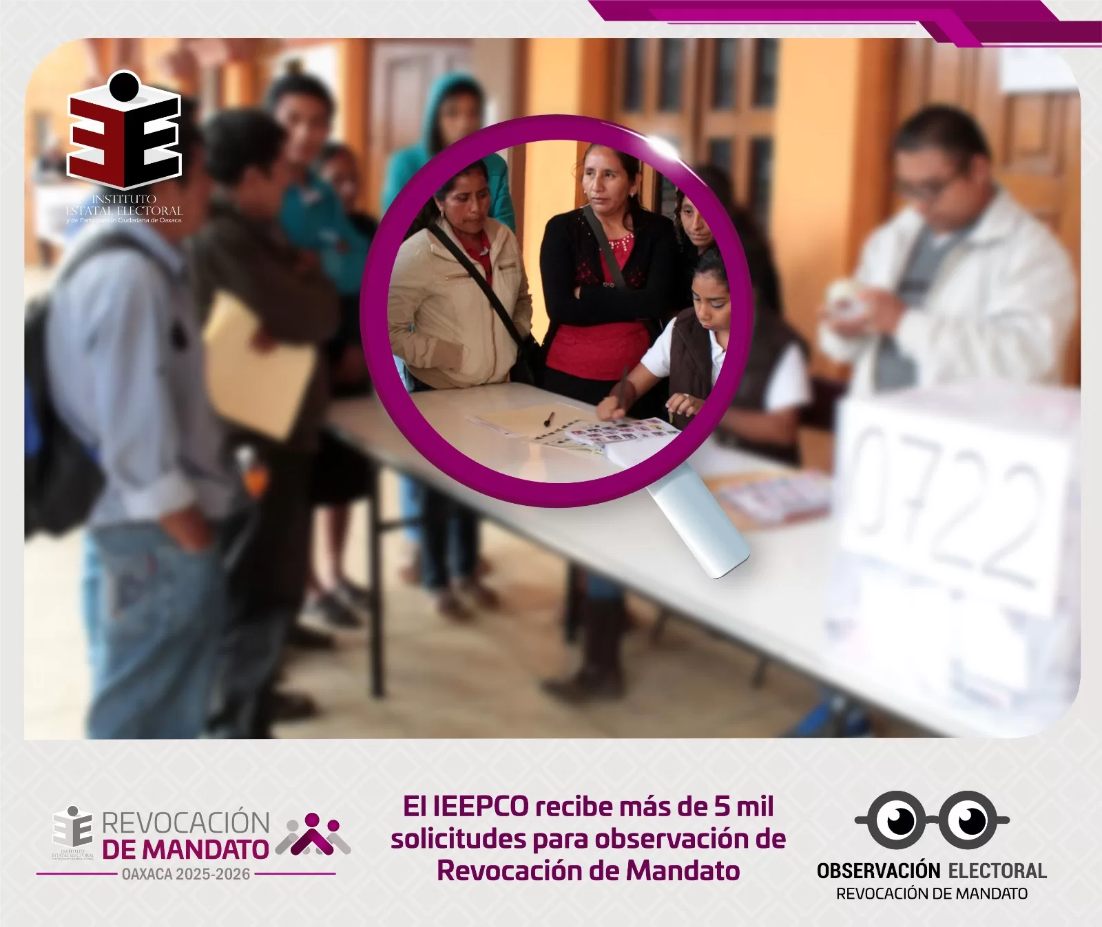 Lo anterior se realiza en cumplimiento de lo dispuesto en el Acuerdo IEEPCO-CG-41/2025, mediante el cual se aprobaron la Convocatoria, sus Anexos y los Lineamientos para la implementación de la observación durante la Jornada de Revocación de Mandato, que se llevará a cabo el domingo 25 de enero, en un horario de 8:00 a 18:00 horas.