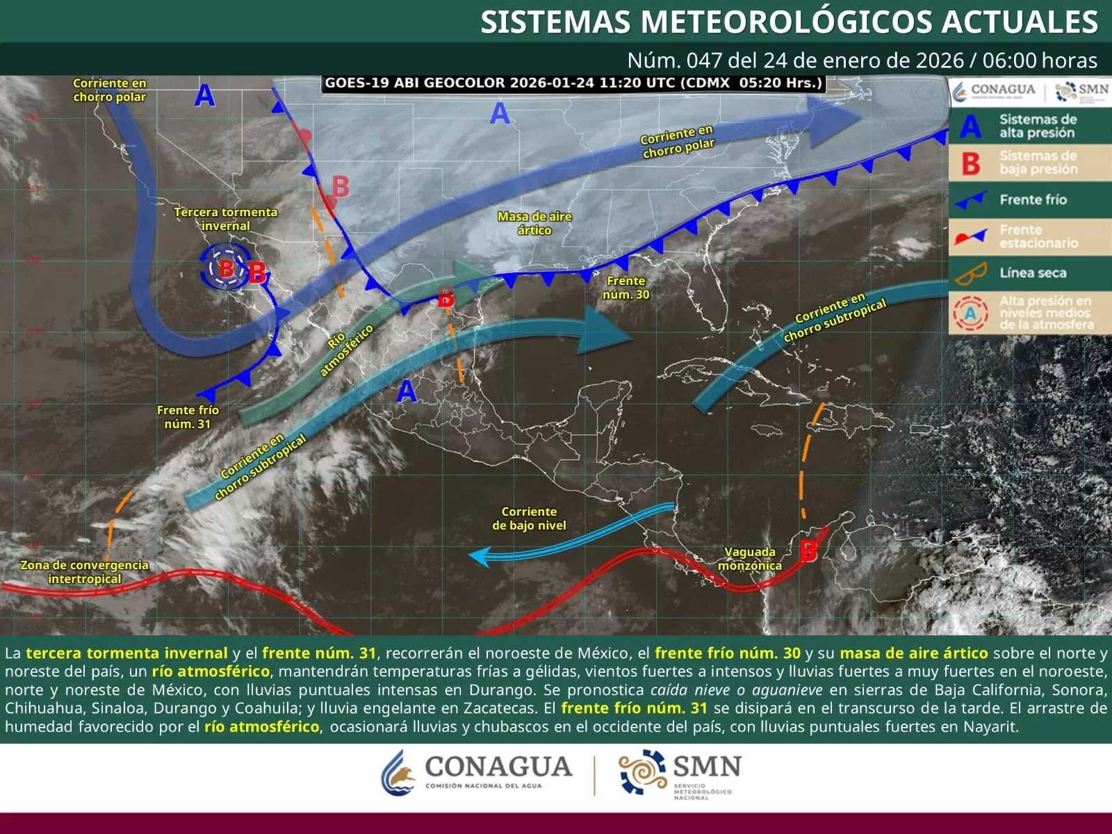 En tanto, el frente frío número 31, ubicado sobre el noroeste de la República Mexicana, presenta alta probabilidad de debilitarse al interactuar con el frente frío número 30 y disiparse al final del día.