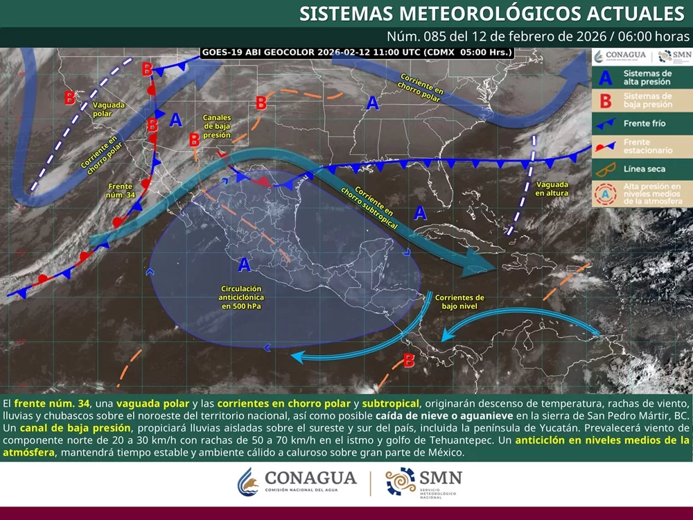 Oaxaca de Juárez, Oax. 12 de febrero de 2026.- La Coordinación Estatal de Protección Civil y Gestión de Riesgos (CEPCyGR) informa que, un flujo anticiclónico continuará generando condiciones meteorológicas estables en gran parte del estado, con presencia de calima al amanecer, cielo mayormente despejado, ambiente seco, intensa radiación solar y aumento progresivo de calor en la tarde.