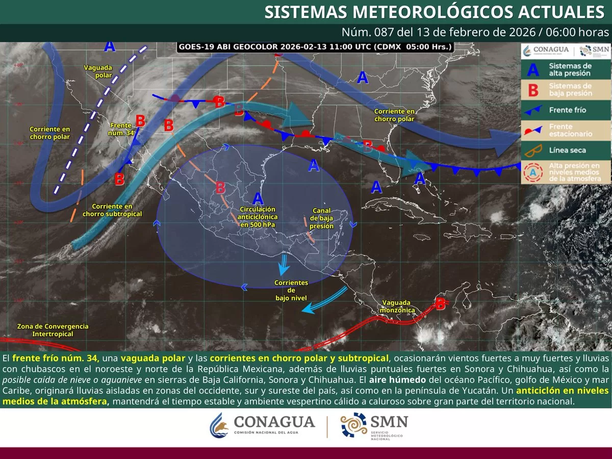 Asimismo, el frente frío número 34 se aproxima sobre el noroeste y norte de la República Mexicana, por lo que se mantiene en vigilancia su evolución.