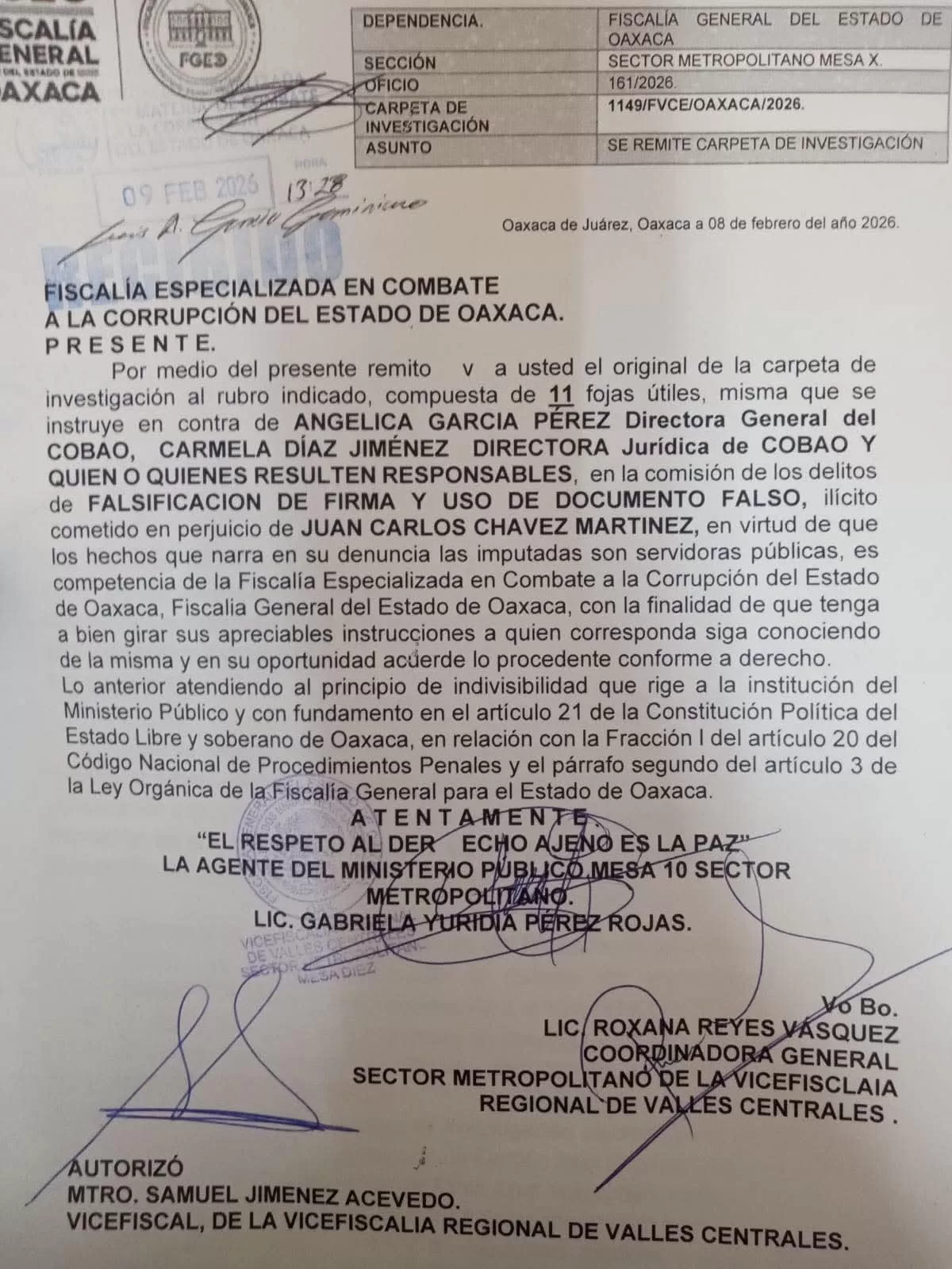 Un documento oficial de la Fiscalía General del Estado de Oaxaca (FGEO) revela que fue remitida una carpeta de investigación a la Fiscalía Especializada en Combate a la Corrupción, relacionada con una denuncia por los presuntos delitos de falsificación de firma y uso de documento falso en el Colegio de Bachilleres del Estado de Oaxaca (COBAO).