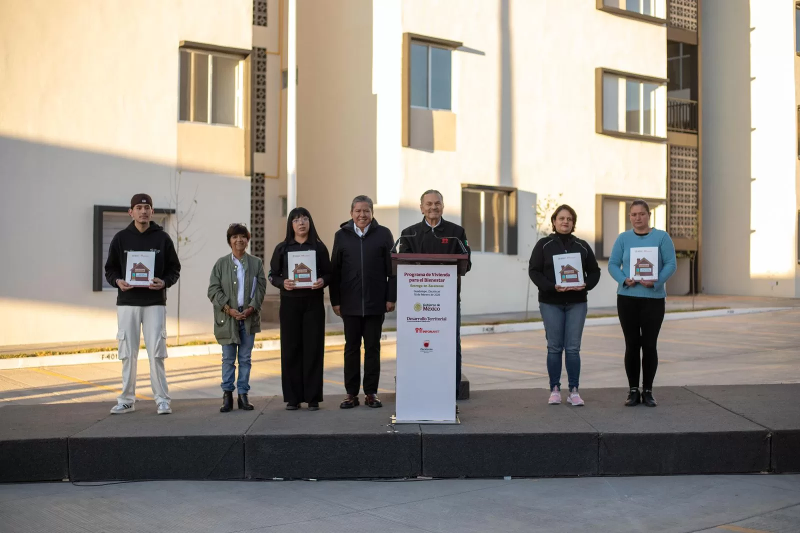 En enlace a la conferencia La Mañanera del Pueblo, encabezada por la Presidenta Claudia Sheinbaum Pardo, en el Miércoles de Vivienda, desde Guadalupe, Zacatecas, el director general del INFONAVIT, el ingeniero Octavio Romero Oropeza; la titular de la Sedatu, Edna Vega Rangel, y el gobernador David Monreal Ávila, entregaron 45 viviendas del Bienestar, ubicadas en el fraccionamiento INFONAVIT Ojo de Agua.