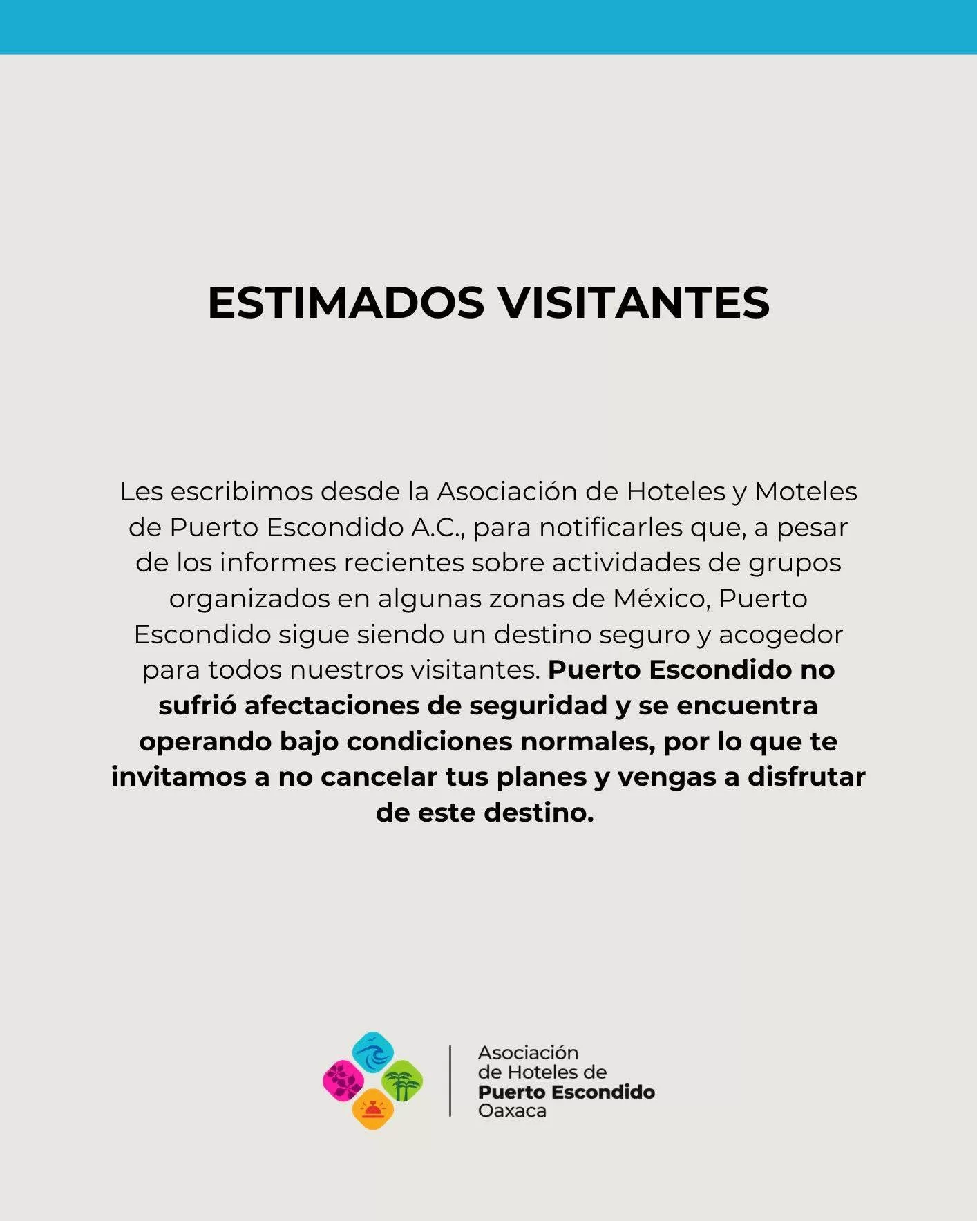 En el mismo sentido, la Asociación de Hoteles y Moteles de Puerto Escondido A.C. dirigió un mensaje a los viajeros en el que subrayó que, a pesar de informes recientes sobre actividades de grupos organizados en algunas zonas del país, Puerto Escondido no sufrió afectaciones de seguridad y se encuentra operando bajo condiciones normales, por lo que invitó a los turistas a no cancelar sus planes y visitar el destino con tranquilidad.