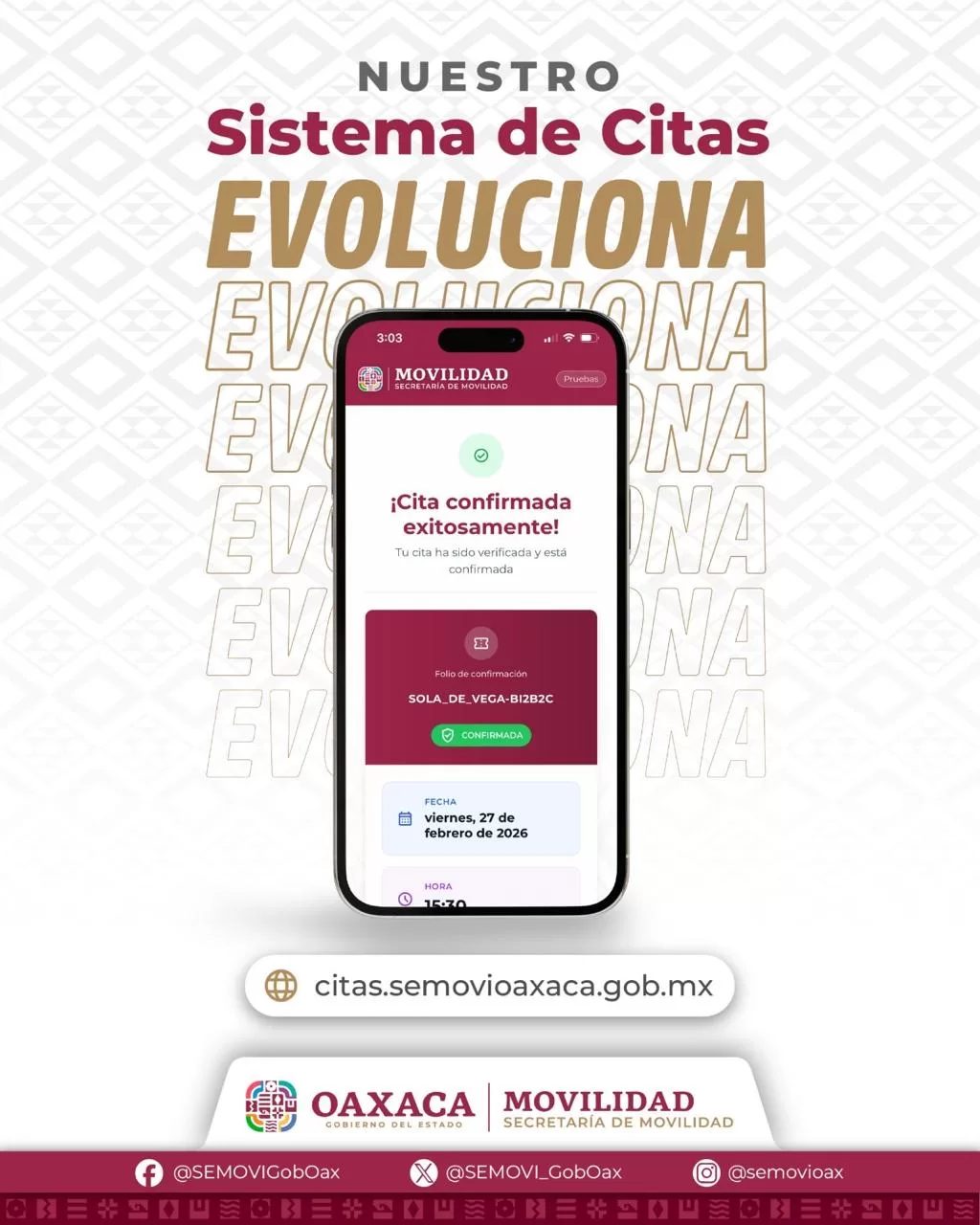 Oaxaca de Juárez, Oaxaca a 28 de febrero de 2025.- En el marco de las acciones de modernización administrativa y mejora continua de los servicios públicos, la Secretaría de Movilidad (Semovi) implementará, a partir de este domingo 1 de marzo, un nuevo sistema de citas para la atención en sus módulos.