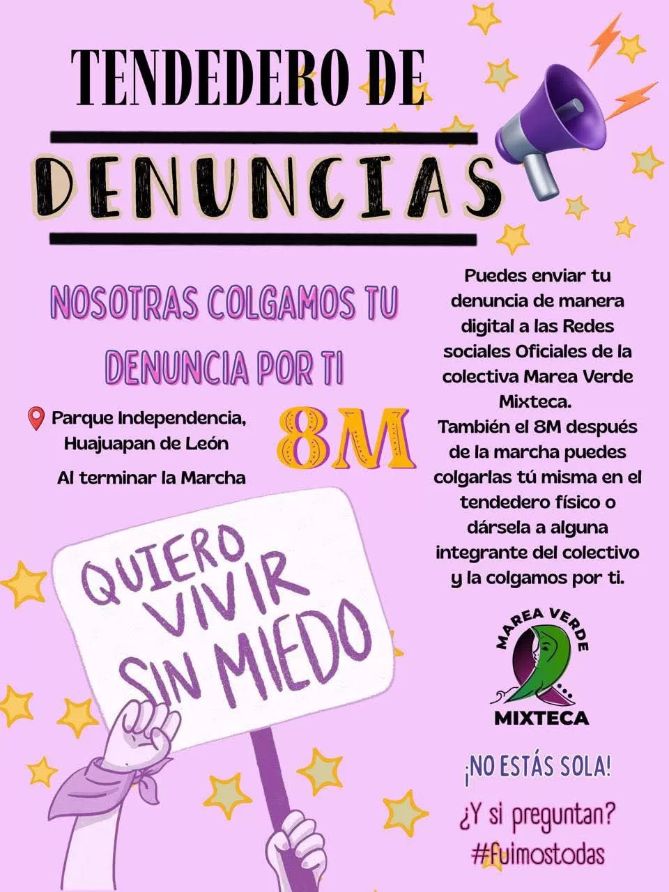En el marco del Día Internacional de la Mujer, la colectiva Marea Verde Mixteca convocó a participar en el “Tendedero de Denuncias”, un espacio destinado a visibilizar casos de violencia de género y acompañar a quienes han sido víctimas.
