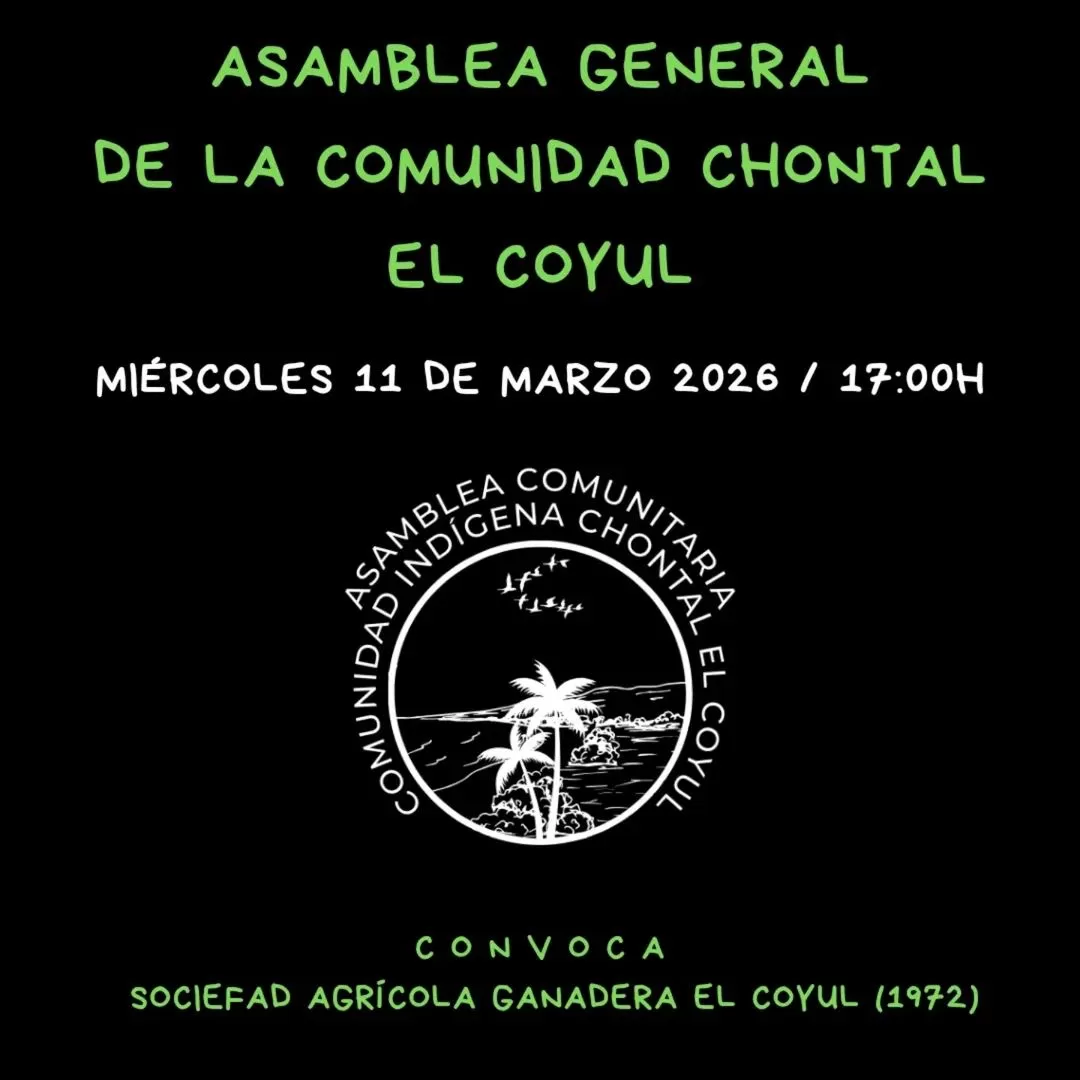 La convocatoria fue emitida por la Legítima Sociedad Agrícola Ganadera El Coyul (1972), que llamó a socias y socios, autoridades comunitarias, comuneros y población en general a asistir a la reunión programada para el miércoles 11 de marzo de 2026 a las 17:00 horas, en la sede de la Cooperativa Pesquera Huamelula (1972).