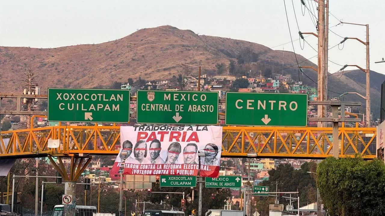 La mañana de este jueves aparecieron diversas lonas colgadas en puentes y puntos visibles de la ciudad de Oaxaca, en las que se señala a legisladores del Partido del Trabajo (PT) y del Partido Verde Ecologista de México (PVEM) como “traidores a la patria”, luego del rechazo a la reforma electoral impulsada por la presidenta Claudia Sheinbaum en la Cámara de Diputados del Congreso de la Unión.