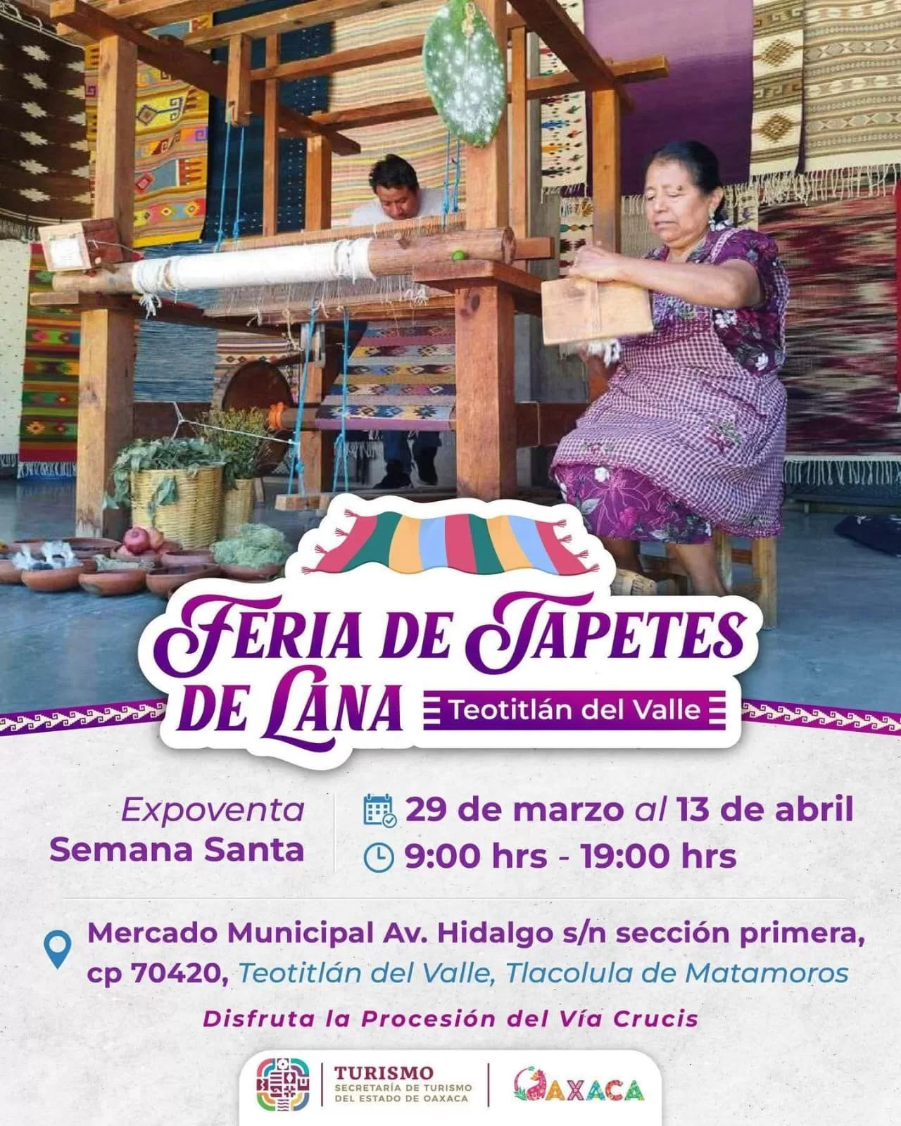 En el municipio de Teotitlán del Valle se llevará a cabo la Expoventa de Semana Santa y la Feria de Tapetes de Lana, un evento que busca promover el trabajo artesanal, los textiles tradicionales y los productos elaborados por habitantes de esta comunidad reconocida por su tradición textil.