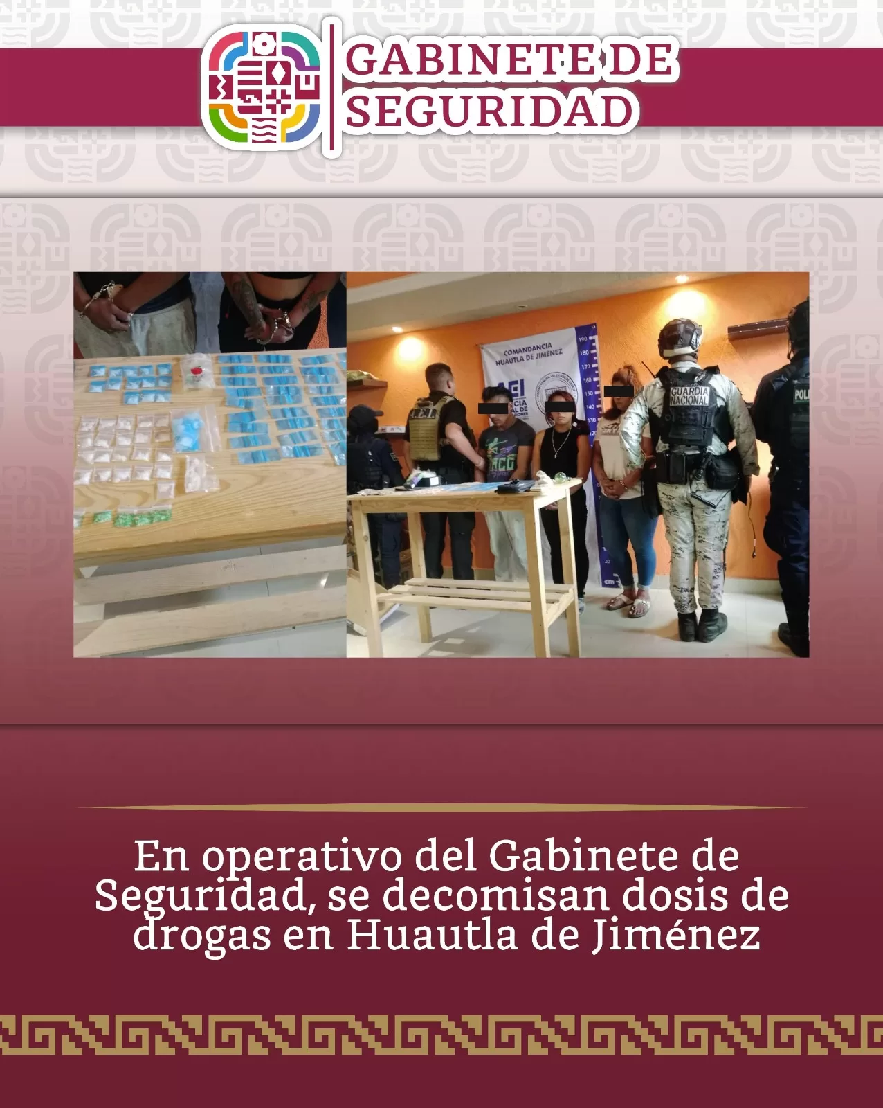 Dicho apoyo consistió en un plan de búsqueda de drogas o estupefacientes en un domicilio ubicado en la calle Circuito Gregorio Herrera, colonia Plan de la Salida, Huautla de Jiménez; donde se llevó a cabo la detención de quienes se identificaron como J. I. G., de 38 años, S. L. O., de 32 años y G. N. G., de 29 años.